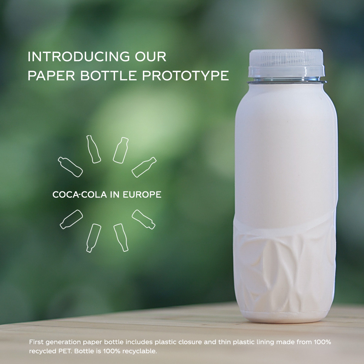 Con la presentación de su botella de papel, la multinacional reafirma su compromiso con el ecodiseño como una de las claves para conseguir Un Mundo sin Residuos, una iniciativa que persigue la meta de recolectaruna botella o lata por cada bebida vendida. Con el objetivo de continuar introduciendo material reciclado e innovando en sus envases, en 2019 Coca-Cola invirtió 180 millones de euros en proyectos de innovación y ecodiseño, dentro de su estrategia Avanzamos de sostenibilidad para Europa Occidental.